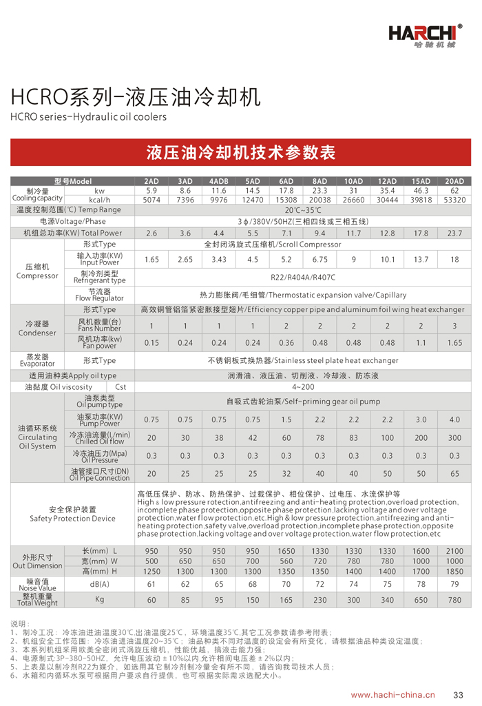 1、制冷能力是在環(huán)境溫度35℃,進(jìn)油溫度35℃,出油溫度30℃,油品為ISO VG32條件下測(cè)得。 2、用戶在選擇油冷機(jī)時(shí),必須選擇油液需控制的溫度范圍(1)18℃-25℃ (2)25℃-35℃ (3)35℃-45℃ (4)45℃以上。本公司推薦液壓油合理的溫度控制范圍為35℃-45℃. 3、油冷機(jī)吸油口必須用硬管連接,且加裝過濾器。 4、吸油管長度不應(yīng)超過1.5米,如超出必須加粗吸油口。 5、油冷機(jī)吸油口應(yīng)靠近設(shè)備回油口,出油口應(yīng)靠近設(shè)備供油口。 6、如吸油口太長,需將油泵與機(jī)組分離。 7、以上機(jī)組使用環(huán)境為5~42℃,42℃以上屬高溫機(jī)組,外形尺寸及相關(guān)參數(shù)會(huì)有所變更,請(qǐng)選型時(shí)注意。 8、參數(shù)表內(nèi)為本公司標(biāo)準(zhǔn)機(jī)型,本公司接受客戶特殊訂貨。 適用種類: ◇ CNC車床、銑床、磨床、拉床 ◇ CNC旋轉(zhuǎn)臺(tái)、油壓機(jī)、木工雕刻機(jī) ◇ CNC立式/臥式加工中心、綜合切削加工中心 ◇ 高速機(jī)械主軸、電主軸、靜壓(動(dòng)靜壓)主軸 ◇ 各種機(jī)械的液壓站及潤滑系統(tǒng) ◇ 放電加工設(shè)備.